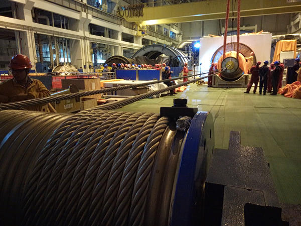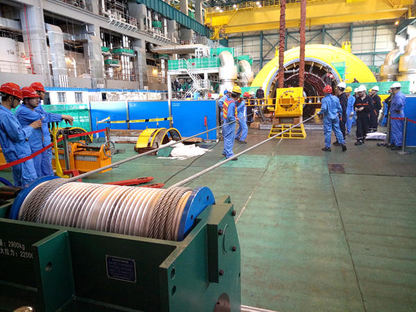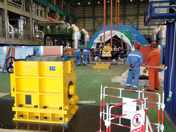 抽穿转子时,电气按钮控制,可安全地把发电机转子抽出和穿入到指定位置,设备配有离合器设计,啮合分离后用手轮能快速的收放钢丝绳(牵引力23t)。