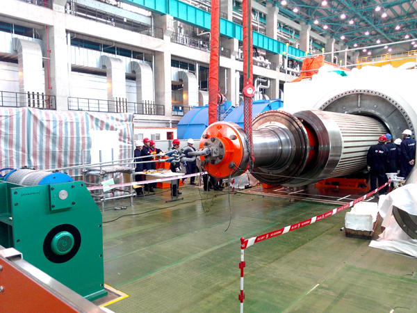 发电机转子穿入装置原理为:采用反作用力方法将转子穿入发电机定子内。将抽穿装置专用定滑轮组固定在发电机定子端面螺丝孔上,通过配套接长轴和小横梁,用反作用力将转子推入定子膛内。